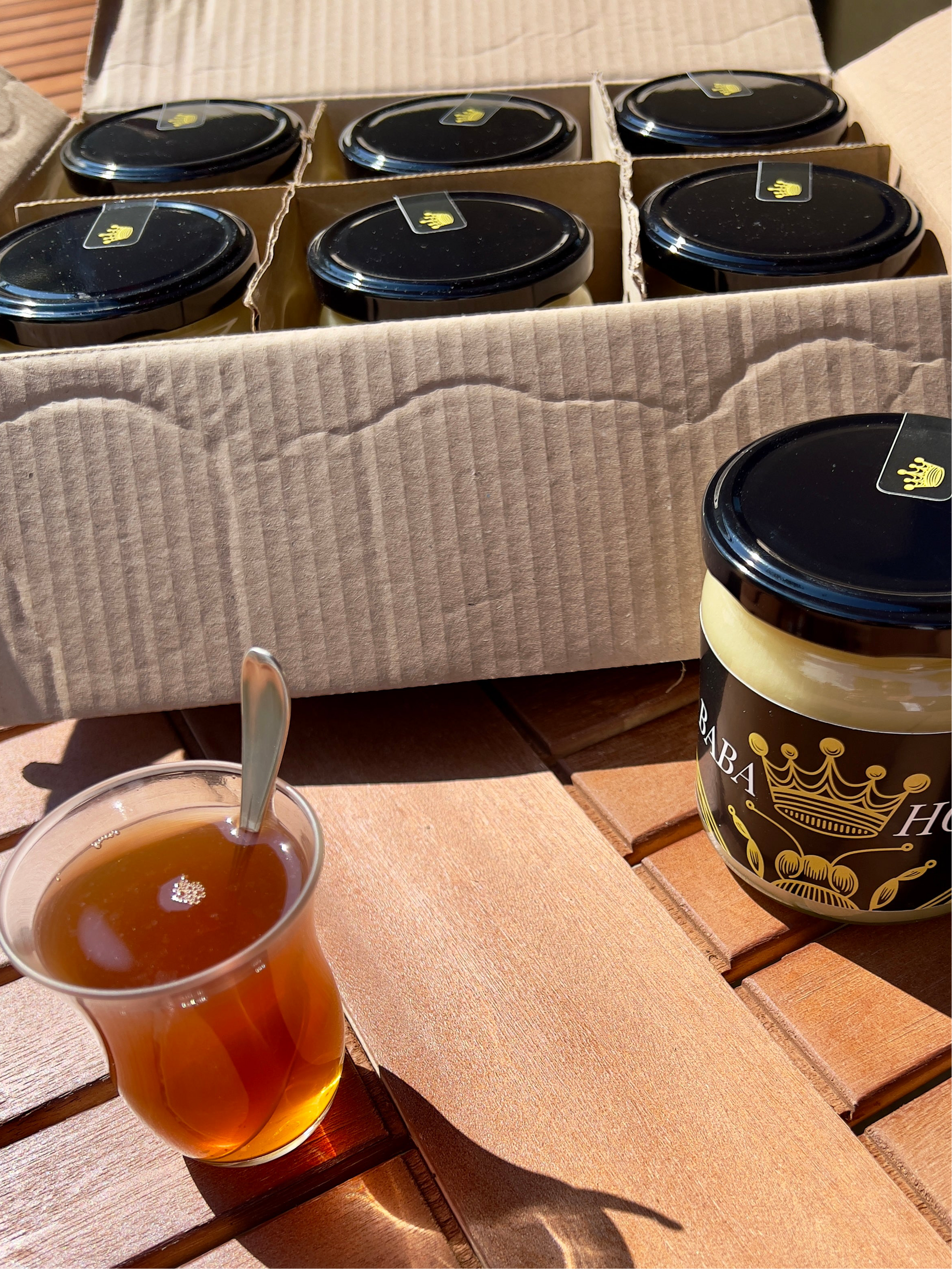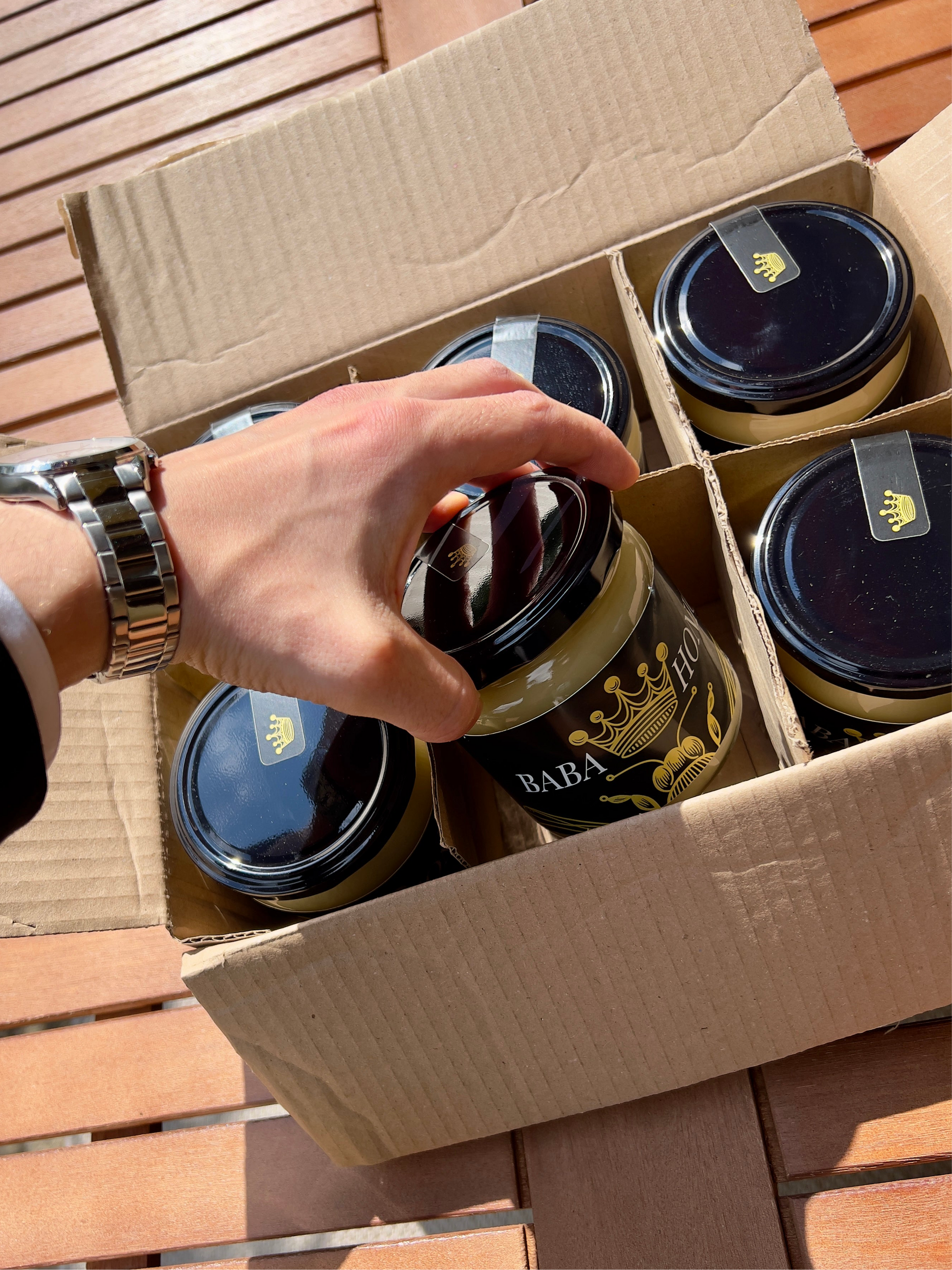 Du bekommst sechs Gläser Baba Honig à 500 g – roh, ungepanscht und ehrlich wie immer. Im stabilen, stylischen Karton mit Baba Branding.